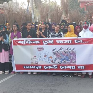 কর্মজীবী নারীদের নিয়ে জামায়াত আমিরের মন্তব্যের প্রতিবাদে ঝাড়ু মিছিল