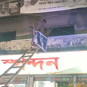 যশোর শহরে পরিত্যক্ত জেলা আওয়ামী লীগের কার্যালয়ে শেখ মুজিবুর রহমান ও শেখ হাসিনার ছবিসংবলিত ব্যানার টানানো হয়েছে। মঙ্গলবার সন্ধ্যা ৭টার পরে শহরের গাড়িখানা সড়কে দলীয় কার্যালয়ের ছাদের সামনের দেয়ালে ব্যানারটি ঝুলতে দেখা যায়।