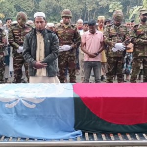 সুদানে জাতিসংঘ শান্তিরক্ষা মিশনে সন্ত্রাসী ড্রোন হামলায় নিহত বাংলাদেশের সেনাসদস্য জাহাঙ্গীর আলমের দাফন সম্পন্ন হয়েছে। রবিবার সন্ধ্যায় কিশোরগঞ্জের পাকুন্দিয়া উপজেলায় নিজ গ্রাম তারাকান্দিতে তাকে দাফন করা হয়।