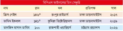 2017 সালের ফাইনালে রংপুর রাইডার্সের হয়ে ক্রিস গেইলের 146 বলে 69 রানের অপরাজিত ইনিংসটি বিপিএলের ইতিহাসে কিংবদন্তি। সেই ম্যাচে গেইলের মার ছিল ৫টি চার ও ১৮টি ছক্কা। দুই বছর পর, তামিম ইকবাল 2019 সালের ফাইনালে কুমিল্লা ভিক্টোরিয়ান্সের হয়ে 61 বলে অপরাজিত 141 রান করেন। তার ব্যাটে এসেছে ১১টি ছক্কা ও ১০টি চার। 2026 সালে, তানজিদ হাসান তামিম রাজশাহীর যোদ্ধাদের তালিকায় নিজের নাম যুক্ত করেন। চিটাগং রয়্যালসের বিপক্ষে তার ব্যাট থেকে আসে ৬২ বলে