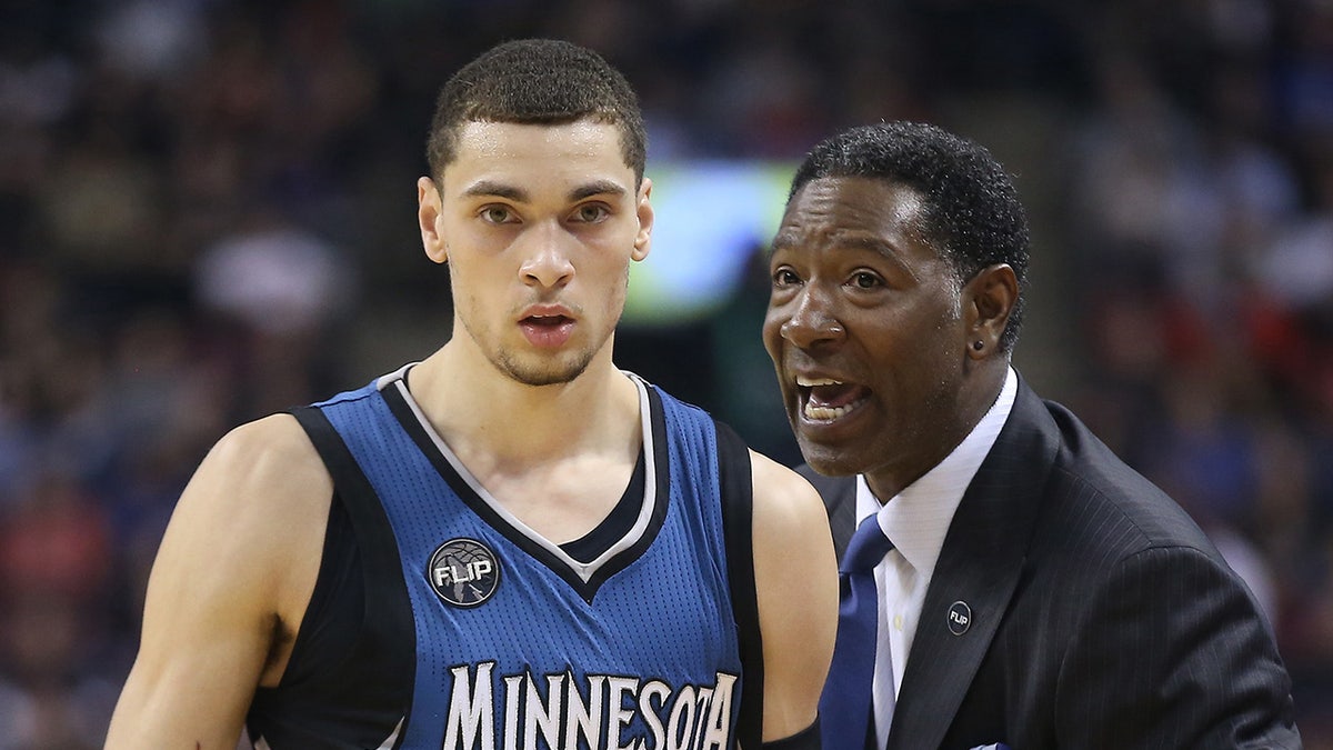 মিনেসোটা টিম্বারওলভস কোচ স্যাম মিচেল (ডানদিকে) 24 ফেব্রুয়ারি, 2016 এ এয়ার কানাডা সেন্টারে টরন্টো র্যাপ্টরদের বিরুদ্ধে জ্যাক ল্যাভিন (8) কে রক্ষা করার জন্য কথা বলছেন। (টম সেজারবোস্কি / ইউএসএ টুডে স্পোর্টস)
